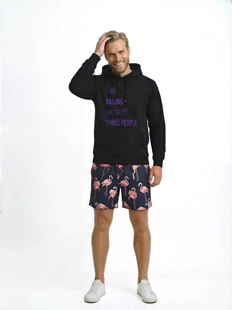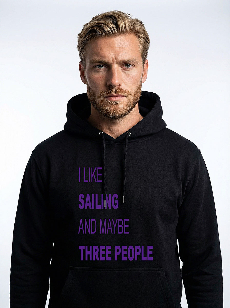 Bluza z kapturem I LIKE SAILING AND MAYBE THREE PEOPLE to połączenie nauki, stylu i wyjątkowej symboliki. Wypukły, aksamitny, trójwymiarowy napis z folii flock nadaje jej elegancji i przyjemnej w dotyku faktury, która przyciąga uwagę. Miękki materiał bluzy gwarantuje komfort noszenia.